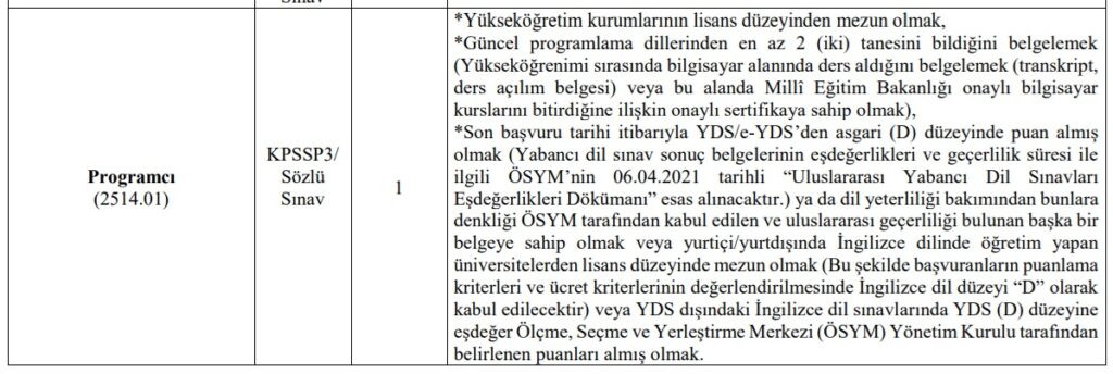 Programcı kadrosu için; - İlan koşullarını sağlayan adaylardan KPSS (B) grubu puan sırasına konulmak kaydıyla alım yapılacak her bir unvan için boş